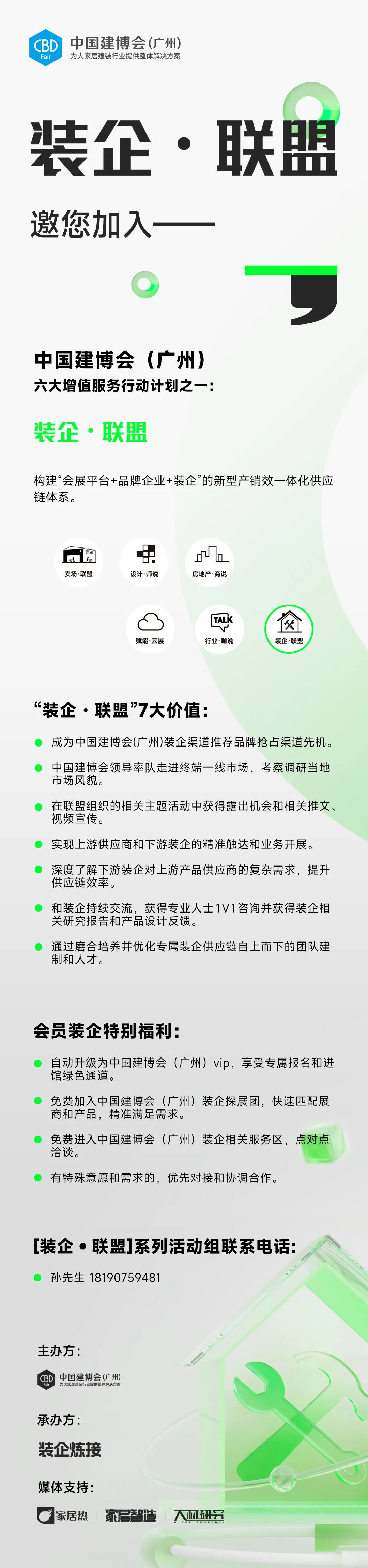 作為大家居建裝行業(yè)全球第一展,中國(guó)建博會(huì)(廣州)針對(duì)廣大參展企業(yè)發(fā)力整裝新市場(chǎng)、拓展裝企新生態(tài)的需求,協(xié)同裝企煉接、裝通、家居熱、大材研究創(chuàng)新知識(shí)傳媒矩陣等行業(yè)組織及媒體,發(fā)起“裝企 ?聯(lián)盟”增值服務(wù),以裝企為創(chuàng)新渠道著力點(diǎn),構(gòu)建“會(huì)展平臺(tái)+品牌企業(yè)+裝企”新型供應(yīng)鏈體系,助力參展企業(yè)與裝企之間精準(zhǔn)對(duì)接和實(shí)效合作,為彼此帶來新的增長(zhǎng)機(jī)遇。