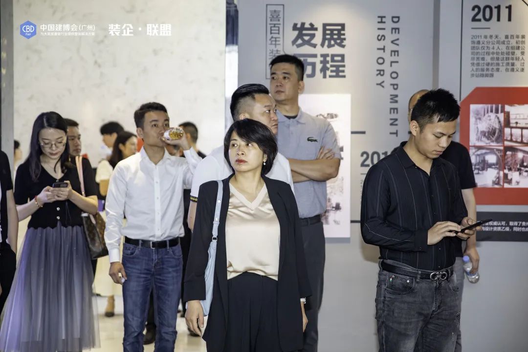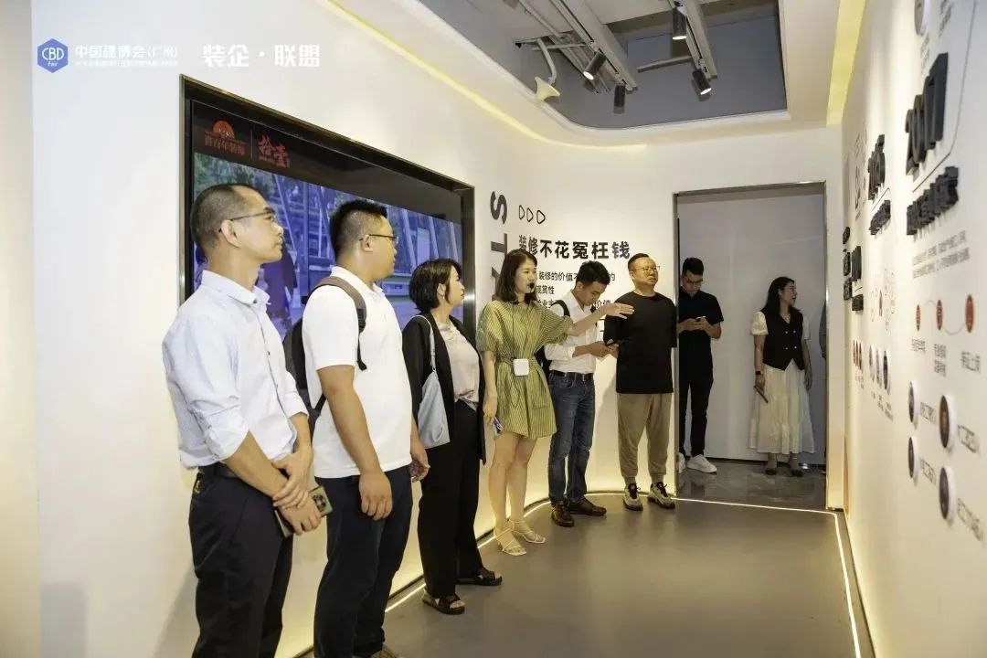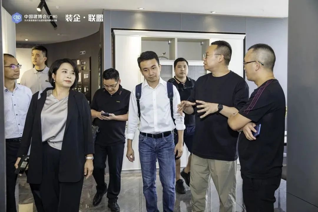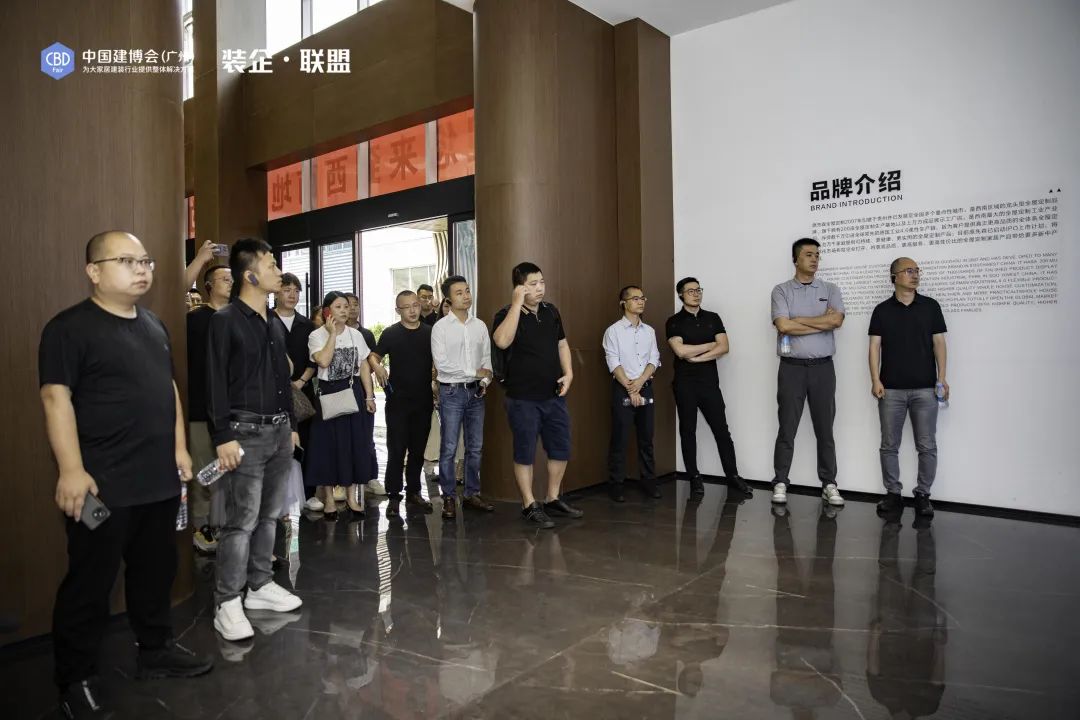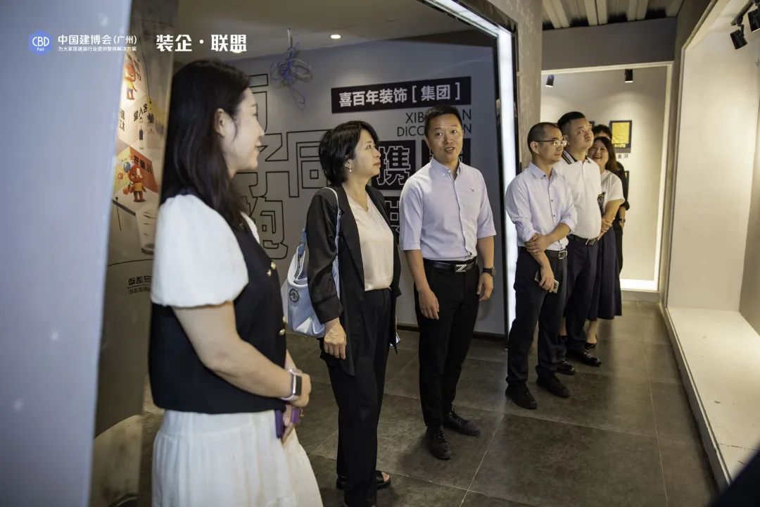 ▲“裝企?聯(lián)盟”參訪團(tuán)隊(duì)在喜百年裝飾展示廳現(xiàn)場(chǎng)
