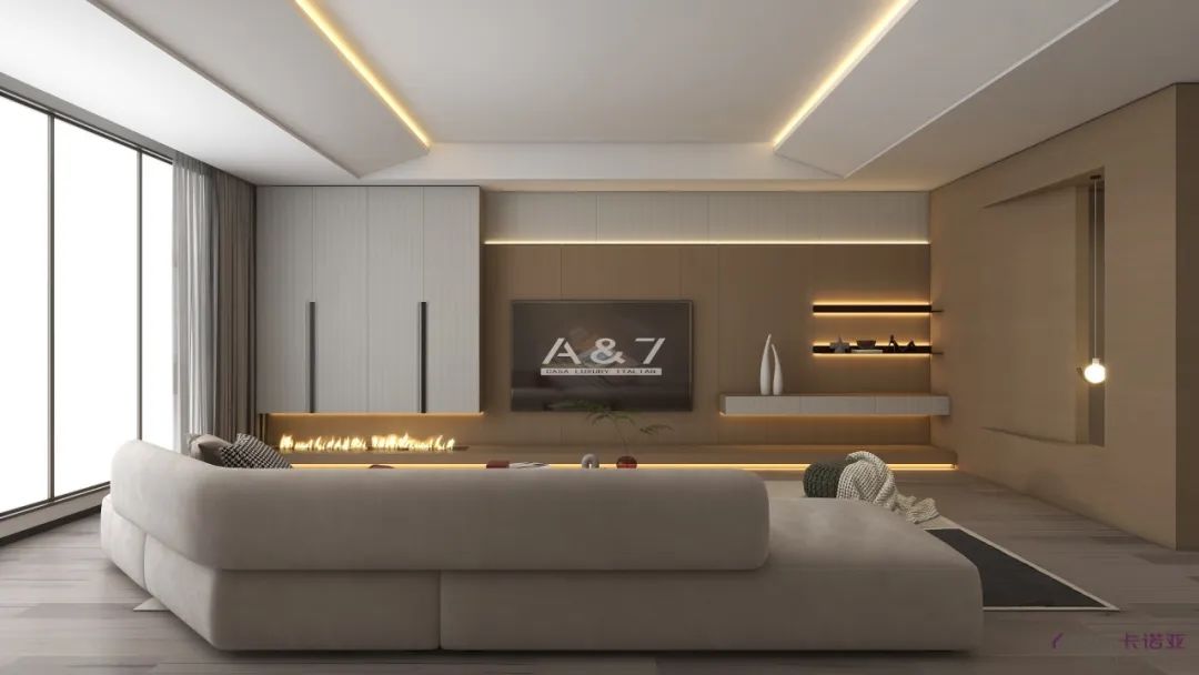 現(xiàn)代法式極簡的空間自帶一種殿堂的美感,其優(yōu)美圓潤的線條自帶優(yōu)雅氣息,同時也可以起到拉伸空間的作用。線條與雕花是法式最重要的兩個元素,讓整個墻面端莊大氣,中間的太陽拼花顯大氣凸出,奢侈又不張揚,搭配法式元素的壁爐,讓客廳空間有種圍爐而坐的溫馨感,獨特的質(zhì)感散發(fā)出專屬的法式浪漫。