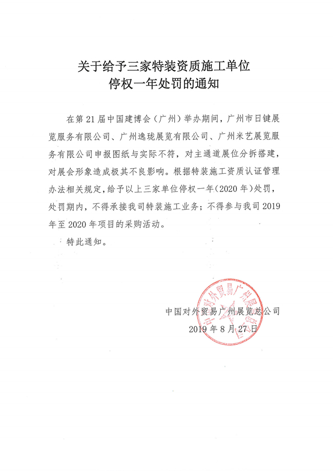 關于給予三家特裝資質施工單位停權一年處罰的通知